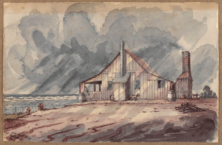 An early settler’s home in the Ballina area. Elizabeth Hughes nee Horseman would have lived in such a home Ref: Edward Forde: album of sketches of New Zealand & NSW ca 1857-1862. Mitchell Library, State Library of NSW.